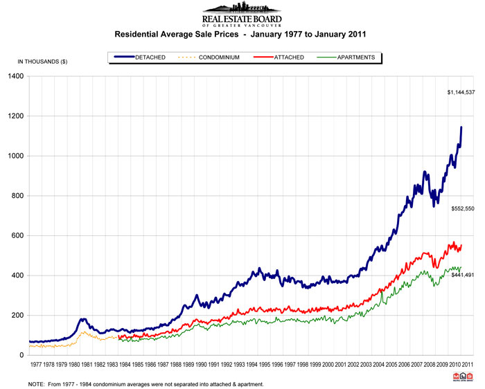 Attached property sales in January 2011 totalled 313, a decline of 4.3 percent compared to the 327 sales in January 2010, and a 187.2 percent increase from the 109 attached properties sold in January 2009. The benchmark price of an attached unit increased 2.6 percent between January 2010 and 2011 to $495,140.
